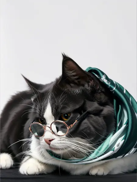 첫 번째 이미지 태그: AP, no humans, cat, realistic, animal focus, animal, blurry, simple background, whiskers, newspaper, gray background, ragdoll, wear sunglasses,