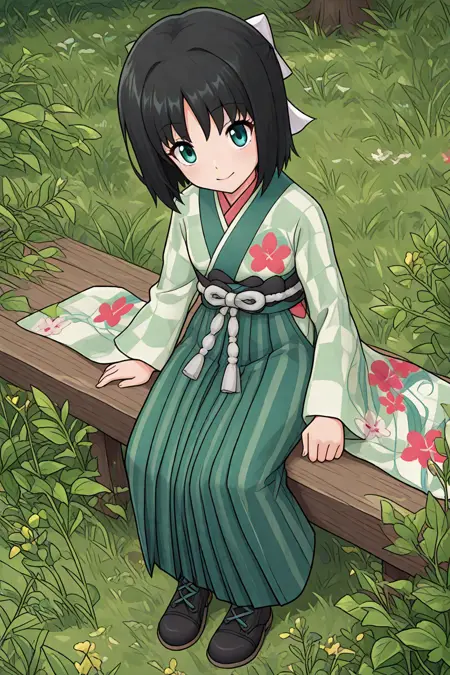 palerika, paleriex, ex_style, black_hair, short_hair, japanese_clothes, green_kimono, green_hakama, floral_print, wide_sleeves, hakama_skirt, hair_bow, boots, black_footwear, cross-laced_footwear, green_laces