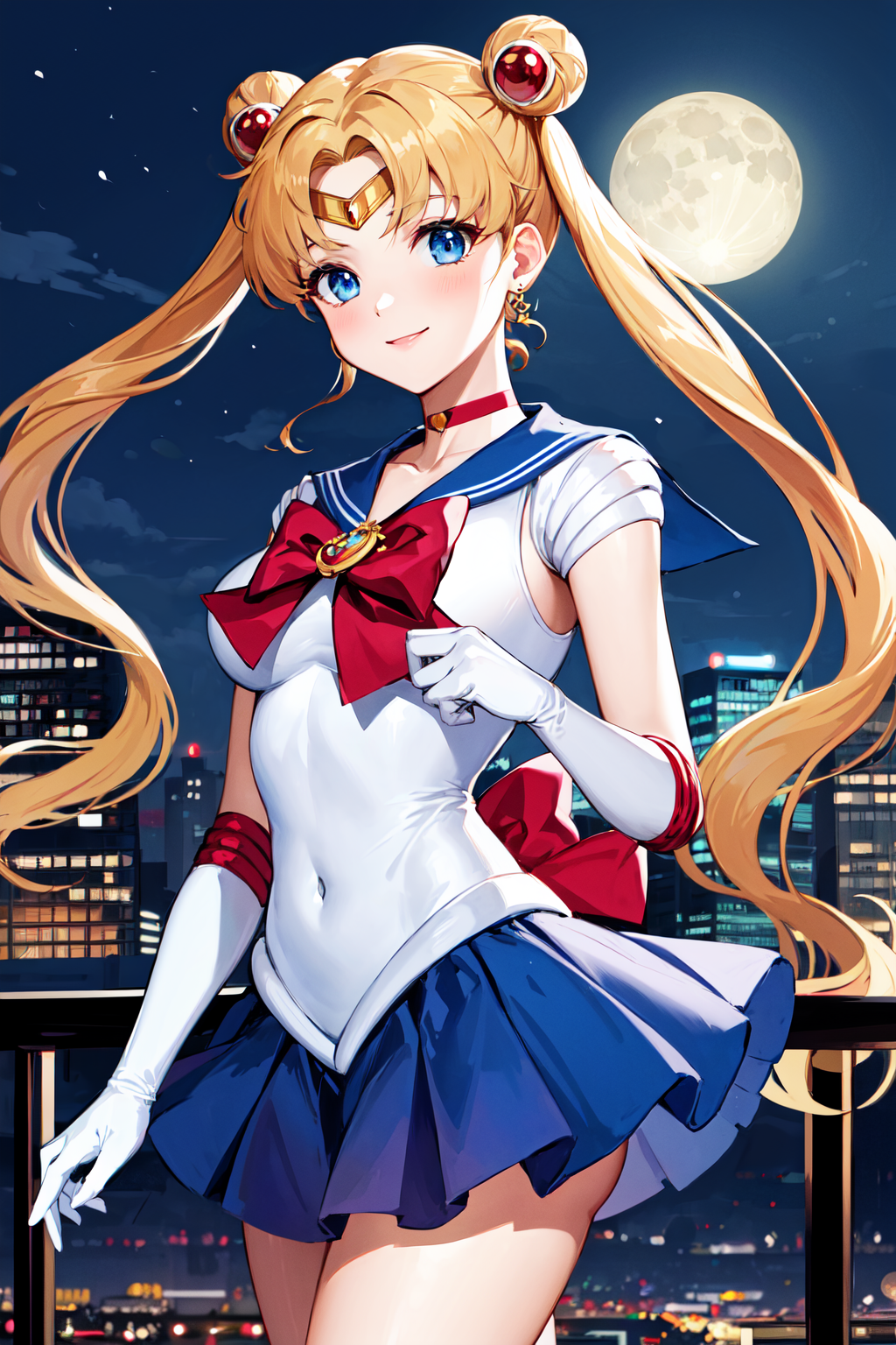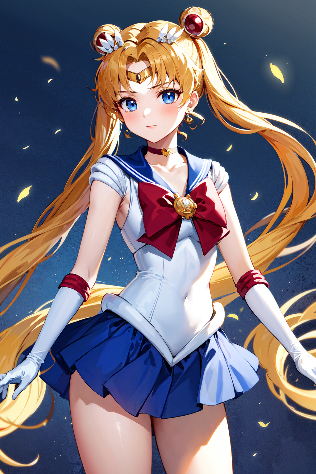 outfit1aausagi, double bun, twintails, parted bangs, circlet, jewelry, earrings, choker, red bow, white gloves, elbow gloves, blue skirt