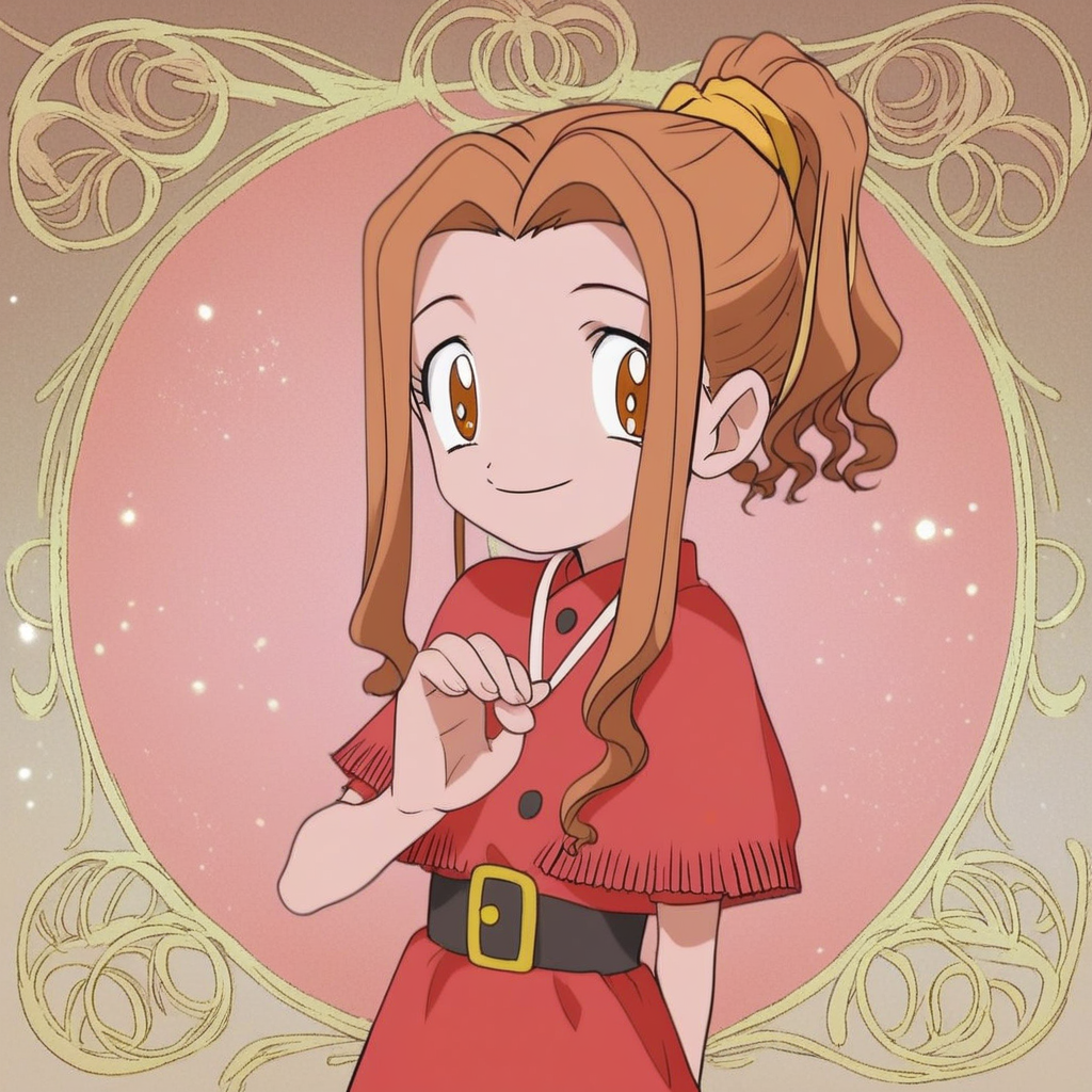 Ponytail: mimi tachikawa, digimon adventure, wavy hair, light brown hair, hight ponytail brown eyes, western-style red dress with a buttoned poncho, brown gloves, pink socks, shoes,