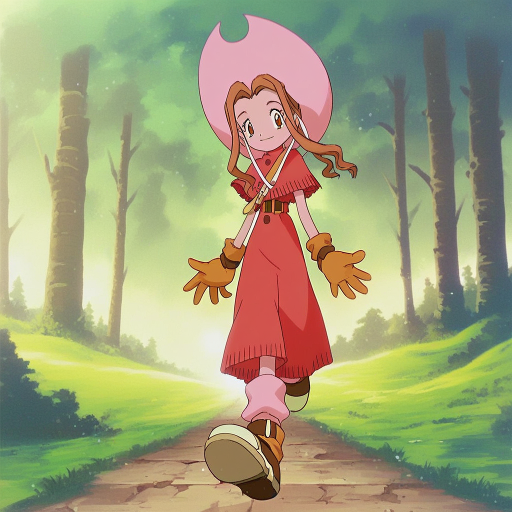 Normal version: mimi tachikawa, digimon adventure, wavy hair, light brown hair, brown eyes, pink hat, western-style red dress with a buttoned poncho, brown gloves, pink socks, shoes,