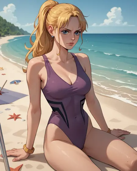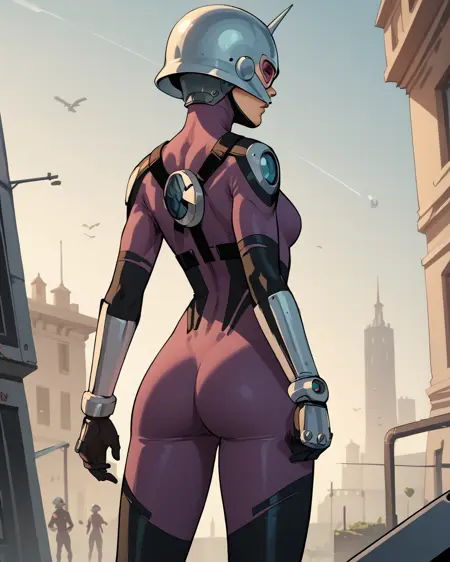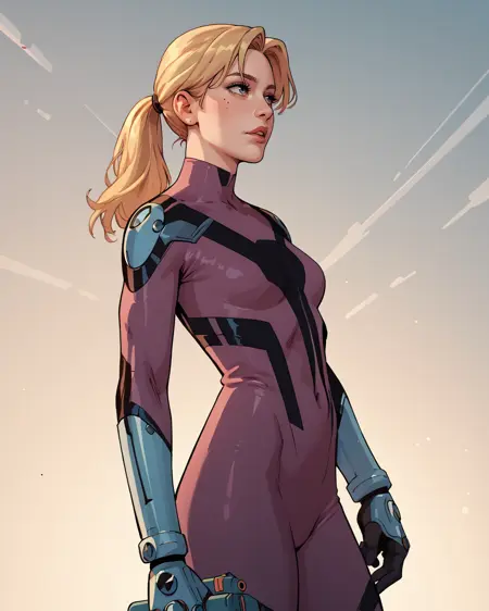 helmet を削除し、blonde hair, ponytail に置き換えて別のルックを実現。