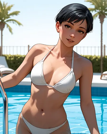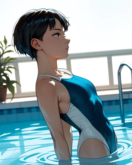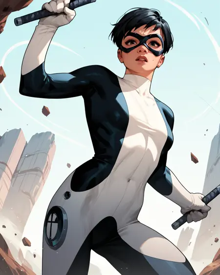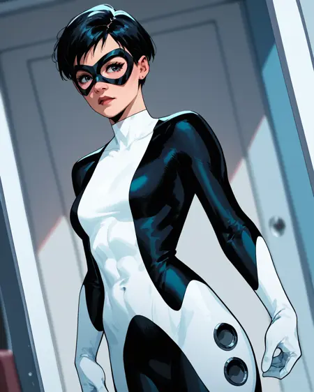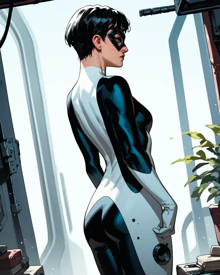 トリガー:1girl, f1nesse, 短髪, 黒髪, ボディスーツ, マスク