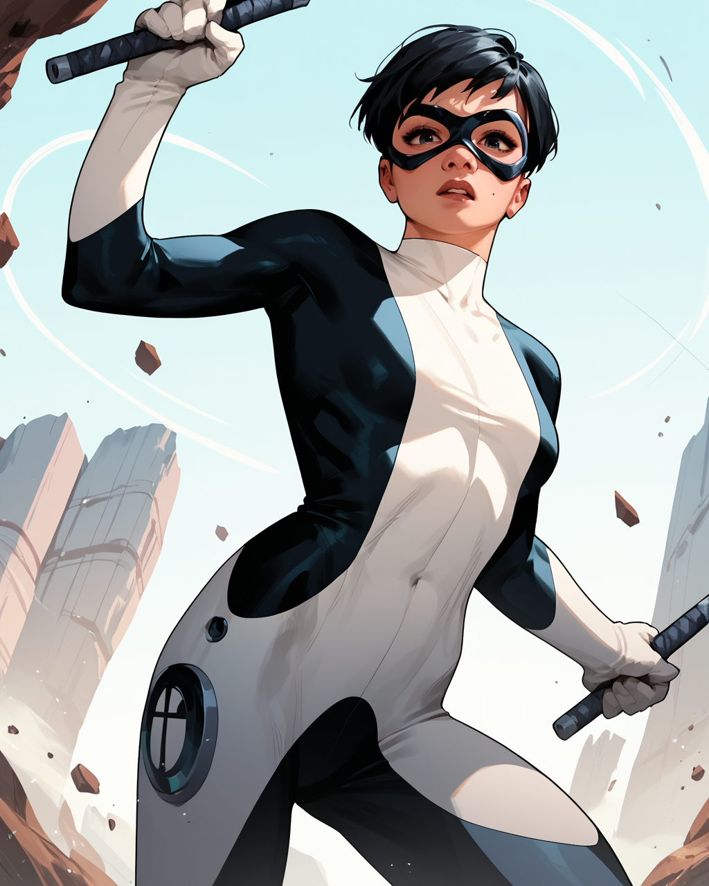 マスクなしの衣装を描きたい場合は、mask を削除してください。彼女のバトンを描きたい場合は、weapon, holding, dual wielding を追加できますが、外観の出来は場合によるため、安定しません。weapon をネガティブに設定すると、不要なときにバトンが表示されるのを防げます。