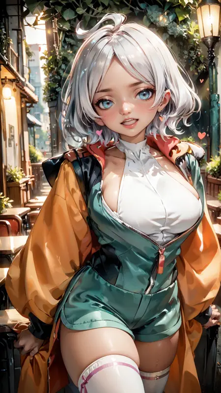 例のプロンプト: "secelia_dote, an anime girl, 1girl, solo, breasts, looking at viewer, smile, short hair, open mouth, large breasts, simple background, thighhighs, white background, school uniform, collarbone, jacket, ahoge, grey hair, heart, thighs, shorts, dark skin, aqua eyes, white thighhighs, dark-skinned female, sideboob, skindentation, green shorts, partially unzipped, asticassia school uniform"