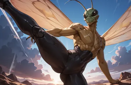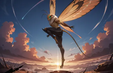 此LoRA的提示词为(蝗虫,外骨骼,拟人化)。有时添加更多相关提示词,如(蝗虫头)和与外骨骼相关的描述,有助于某些检查点。我发现某个检查点不知为何只生成突变图像,但除此之外,它在所有其他检查点上都能良好运行。