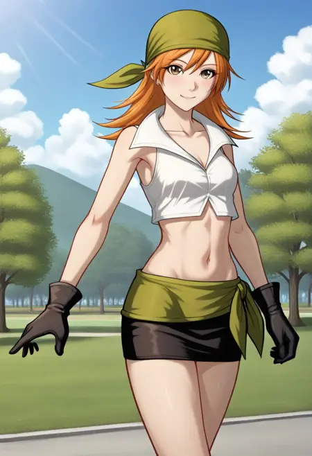 衣装 - THI3F、バンダナ、緑色のヘアウェア、白いシャツ、カロップトップ、黒い手袋、黒いスカート、ミニスカート