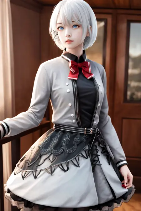 기본 옷차림: 빨간 리본 넥타이, 검은 셔츠, 회색 재킷, 회색 드레스, 검은 치마, 검은 벨트, 프릴, 검은 팬티스타킹