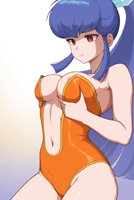 橙色比基尼: 橙色紧身衣,橙色鞋履,中央开口,肚脐,裸露肩部,胸部显露,中等大小胸部