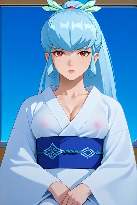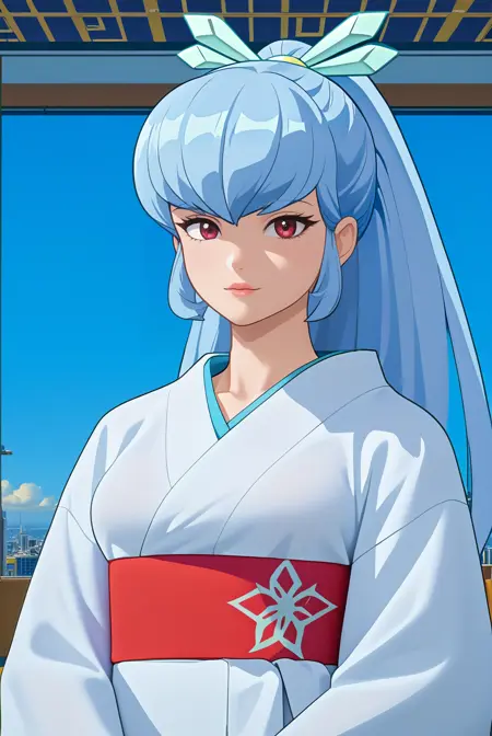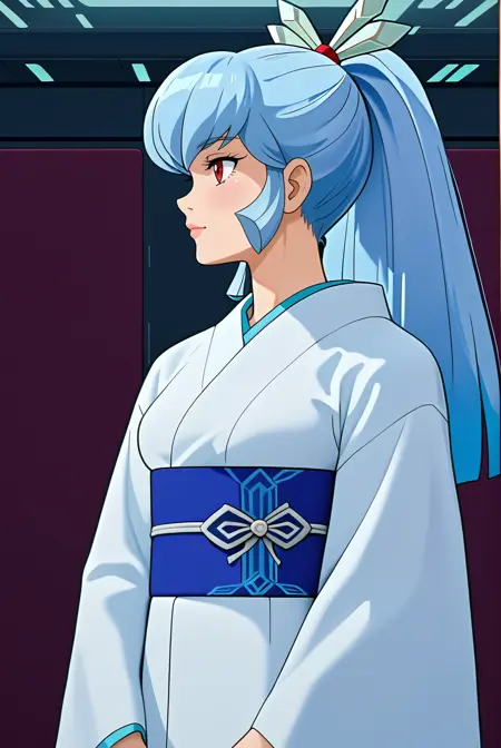Main Trigger: oyuki, long hair, light blue hair, high ponytail, bangs, hair ornament, red eyes, retro artstyle, 1980s (style)