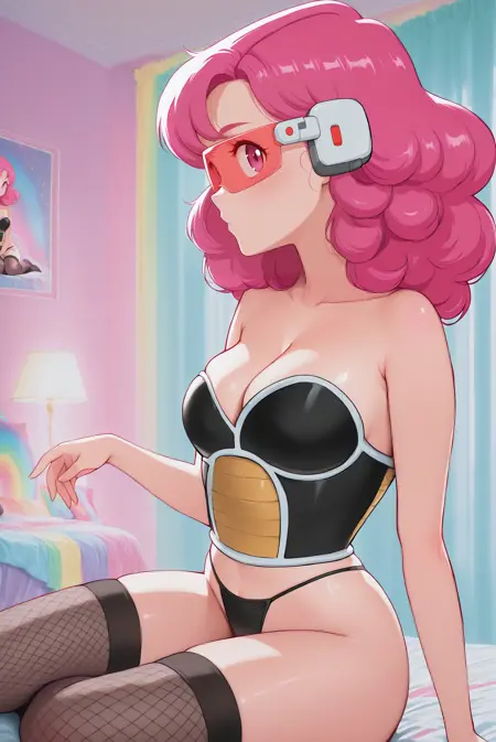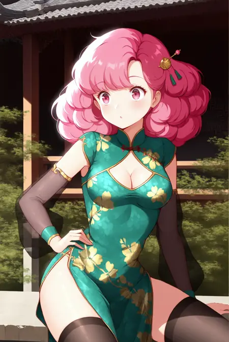 主触发词: ran, 粉色眼睛, 卷发, 粉色头发, 复古艺术风格, 1980年代(风格)