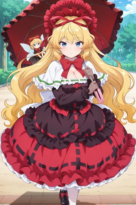 medicine melancholy, 1girl, solo, blue eyes, blonde hair, long hair, large breasts,, medicine melancholy (big sweet litte poison), alternate costume, aged up, red bonnet, hair ribbon, red ribbon, white capelet, red bowtie, cleavage, black shirt, ribbon-trimmed shirt, long sleeves, fishnet gloves, layered skirt, black skirt, red skirt, frilled skirt, ribbon-trimmed skirt, white pantyhose, two-tone shoes, black shoes, red shoes, holding umbrella, red umbrella,