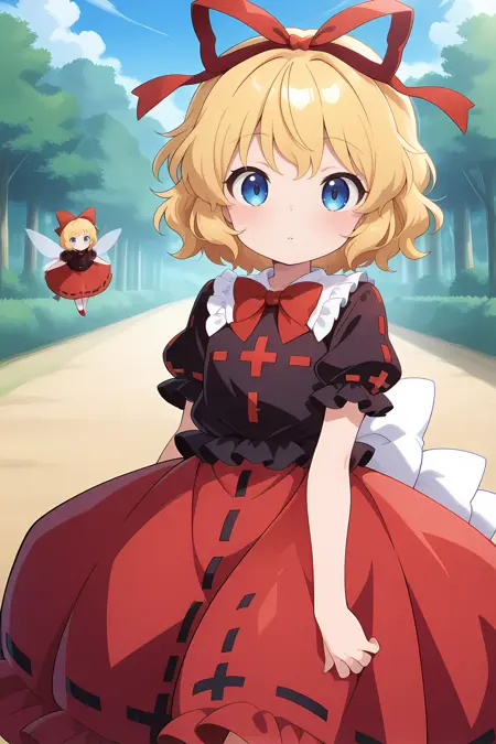 hair ribbon, red ribbon, red bow, black shirt, puffy sleeves, short sleeves, frills, frilled shirt collar, frilled sleeves, frilled shirt, red skirt,