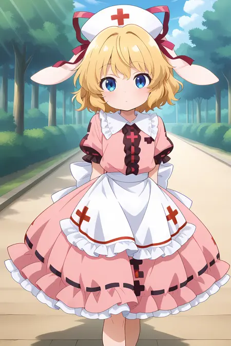 medicine melancholy, 1girl, solo, blue eyes, blonde hair, medium hair, wavy hair, medicine melancholy (rabbit-eared soldier), alternate costume, white ears, rabbit ears, nurse cap, white hat, hair ribbon, pink ribbon, hairclip, white bowtie, white apron, pink dress, plaid dress, long sleeves, white armband, back bow, white bow, white socks, mary janes, pink shoes,