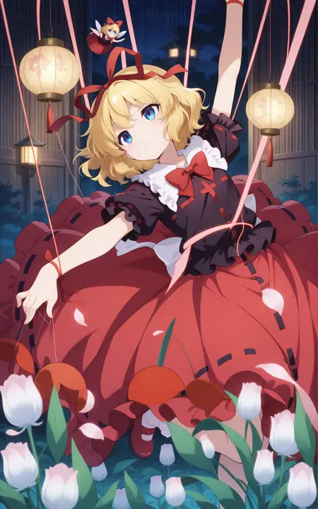 medicine melancholy, 1girl, solo, blue eyes, blonde hair, long hair, large breasts,, medicine melancholy (big sweet litte poison), alternate costume, aged up, red bonnet, hair ribbon, red ribbon, white capelet, red bowtie, cleavage, black shirt, ribbon-trimmed shirt, long sleeves, fishnet gloves, layered skirt, black skirt, red skirt, frilled skirt, ribbon-trimmed skirt, white pantyhose, two-tone shoes, black shoes, red shoes, holding umbrella, red umbrella,