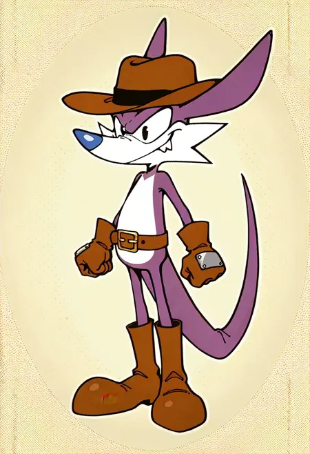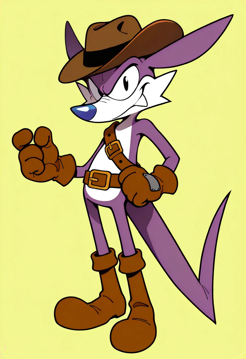 | Trained Words | FaangSN1per, 1boy, anthropomorphic jerboa, black eyes, purple fur, white fur, two tone fur, large sharp fang, long ears, pointy blue nose, long feet, long thick purple tail, big brown Stetson hat, brown gloves, brown belt, brown boots, short,Copied! |