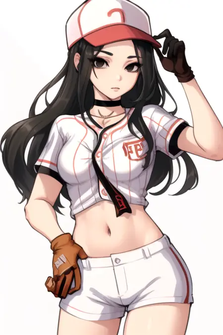 JinheeDokkaebi, 1girl, solo, long hair, striped shirt, black hair, gloves, navel, medium breasts, short sleeves, short shorts, black choker, midriff, black eyes, crop top, baseball cap, white shorts, baseball uniform,