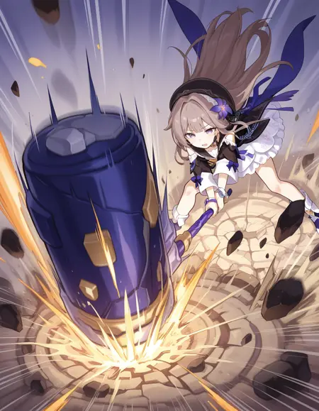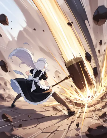一个角色用巨大的锤子砸向地面,地面出现明显裂痕的动作LoRA。由于数据集较少,转身可能但较困难。风格渗出强烈,因此需要通过高分辨率提示调整和LoRACtl进行一些微调。此模型在Forge/Reforge上生成,不知为何我无法在A1111上获得相同的效果。
