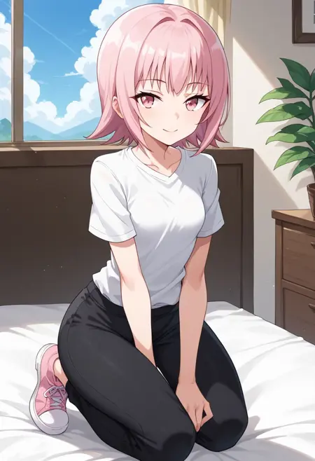 1个女孩,玉村玉雄,粉发,粉眼,短发,(小胸),白衬衫,短袖,黑裤,粉鞋