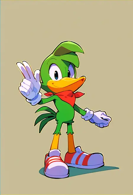 | Trained Words | BeEan, 1boy, green anthropomorphic woodpecker, black eyes, yellow beak, orange legs, two spiky tufts of feathers protruding from head, two long tail feathers, red neckerchief around neck, white gloves with cuffs, red flat shoes, gray soles, short, Copied! |
