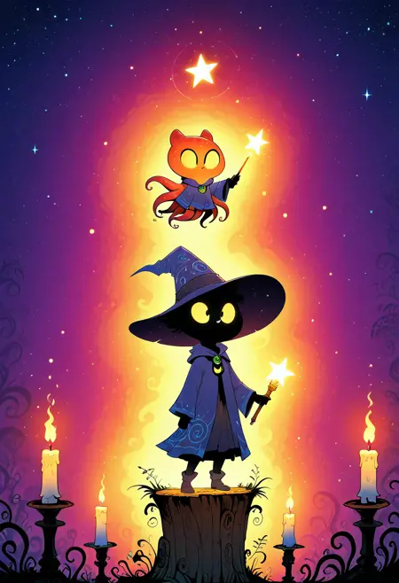 诡异可爱魔法是一种充满童趣与魔力的融合风格,旨在为你的艺术作品增添鲜明而超现实的色彩。在这个风格中,你会看到拥有大而富有表现力眼睛的角色、高对比度的明亮色彩,以及在“可爱”与恰到好处的“诡异”之间取得微妙平衡的整体氛围。想象一下:甜美而阴暗的生物、隐藏着强大力量的魔法生物,或是散发着诡异魅力的幽灵旋转木马。这个LoRA专为2D或2.5D插画设计,赋予画面如油画般的质感,令人眼前一亮。