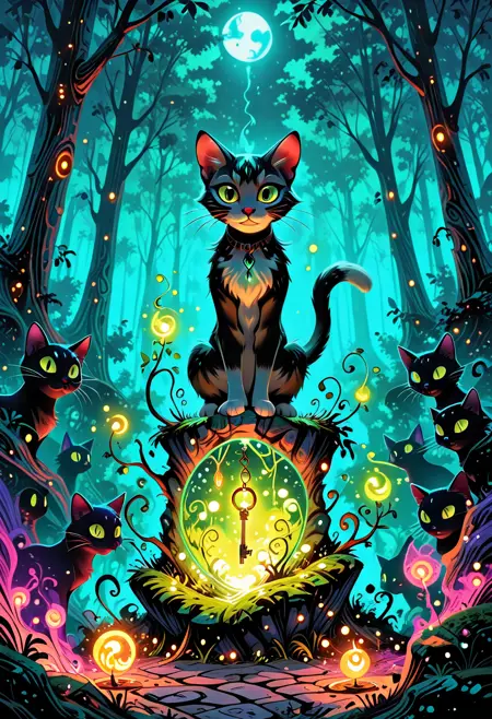 由于该LoRA融合了多种灵感来源,它并不拘泥于单一艺术风格,而是我钟爱特质的大杂烩:生动的色彩、细腻的细节,以及潜藏其中的魔法气息。