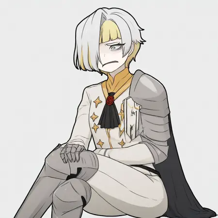 kromer, 1girl, white hair with yellow accents, hair over one eye, solo, multicolored hair, short hair, grey eyes, military uniform, pauldrons, cape, ascot