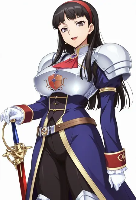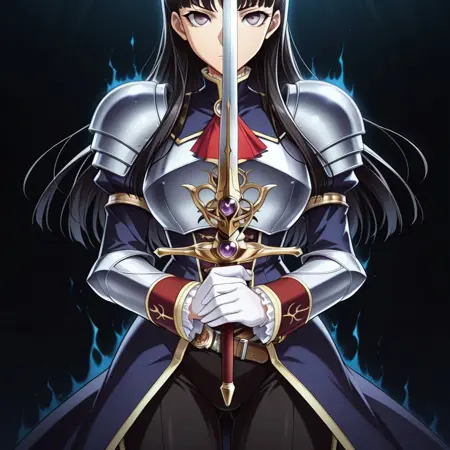 ascot,brooch,white gloves,juliet sleeves,corset,frills,black pants,jewelry,long sleeves, armor,sword,weapon,belt,breastplate,armored blue dress,armored boots,shoulder pad,