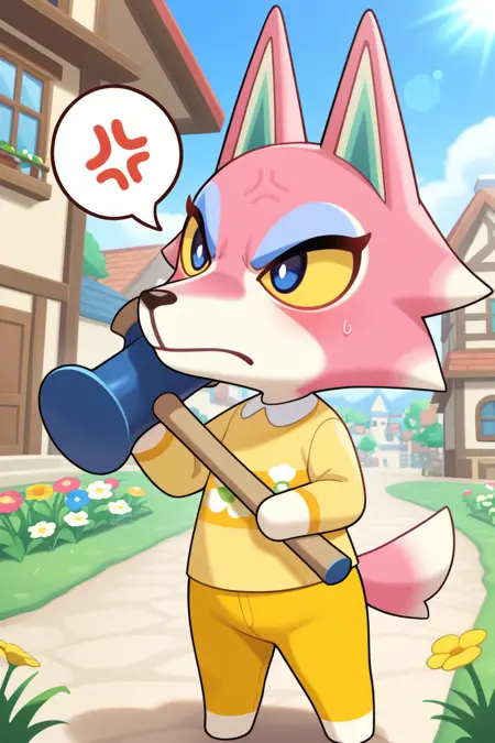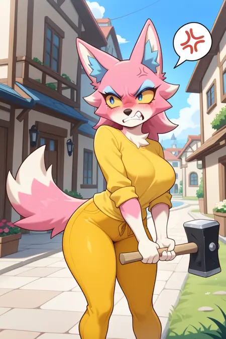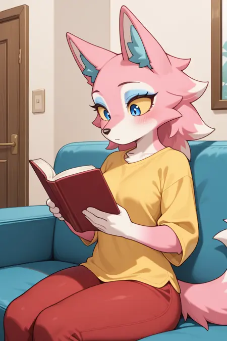 Tags: Fr3ya, anthro, furry female, pink fur, blue eyes, colored sclera, yellow sclera, blue eyeshadow, wolf tail