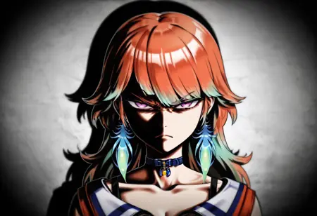 angrystarememe, half-closed eyes, shadow, glaring, frown, scowl, serious, angry, v-shaped eyebrows, looking at viewer, upper body, collar bone, photo background, right aligned, dark, highlights