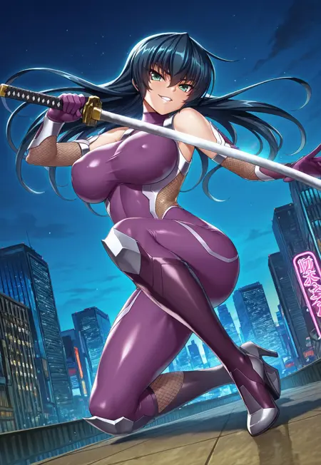 第一套服装:紫色紧身衣,露肩,肘部手套,渔网袜,渔网腿袜,高跟靴