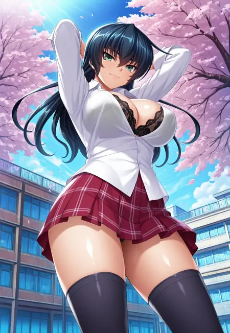 第二套服装:校服,部分未扣,露出乳沟,白色衬衫,卷起袖子,黑色文胸,内衣,红色裙子,格子裙,百褶裙,及膝袜,深蓝色袜子,蕾丝边文胸,内裤,黑色过膝袜,黑色乐福鞋