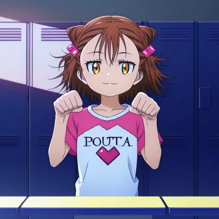 ryouka miketa, medalist, yellow eyes, brown hair, cone hair bun, double bun, hair ornament, short hair