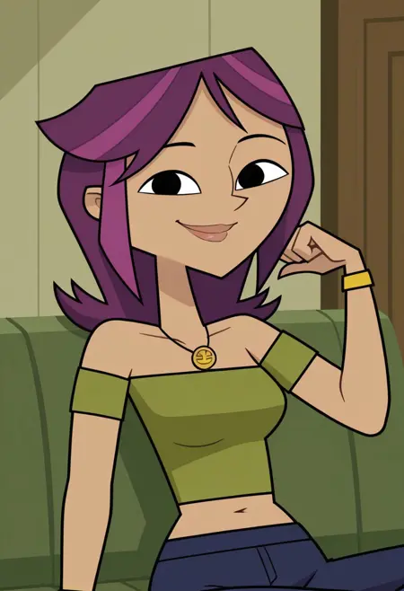 1girl, Solo, RosaMaria_DC, 올리브색 피부, 검은 눈, 분홍색 스트라이프가 있는 보라색 머리, 어깨 길이의 머리, 앞머리