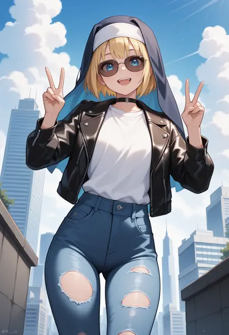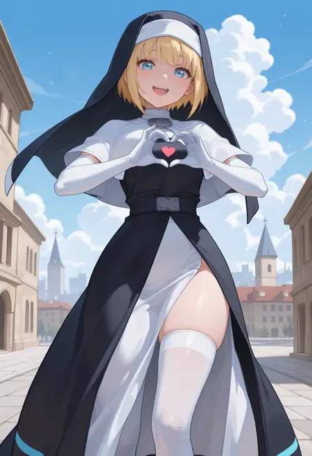 デフォルトの衣装: 修道女, 修道服, 白いカペレット, 黒いドレス, 白い手袋, 肘まである手袋, 骨盤カーテン, 白い太ももまであるストッキング