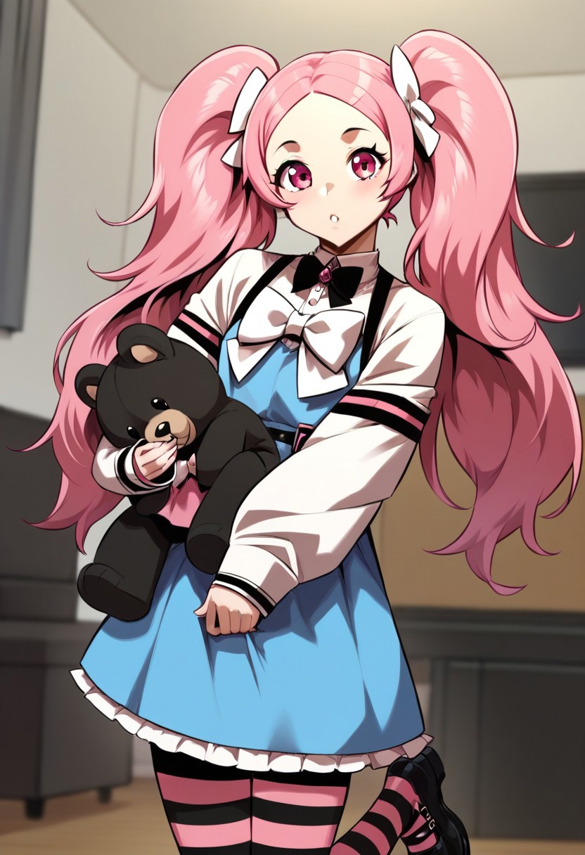 1girl,gpandora,pink hair,pink eyes,twintails,long hair,solo,dress,blue dress,white bow,sleeves past wrists,striped pantyhose,shoes,black footwear,holding,teddy bear,stuffed toy,