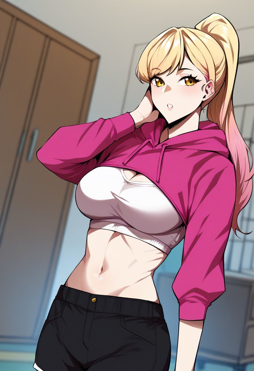 1girl,gnomnyam,large breasts,yellow eyes,multicolored hair,pink hair,gradient hair,blonde hair,long hair,ponytail,hood,pink hoodie,cropped hoodie,hood down,sports bra,crop top,midriff,navel,black shorts,high-waist shorts,pink shoes