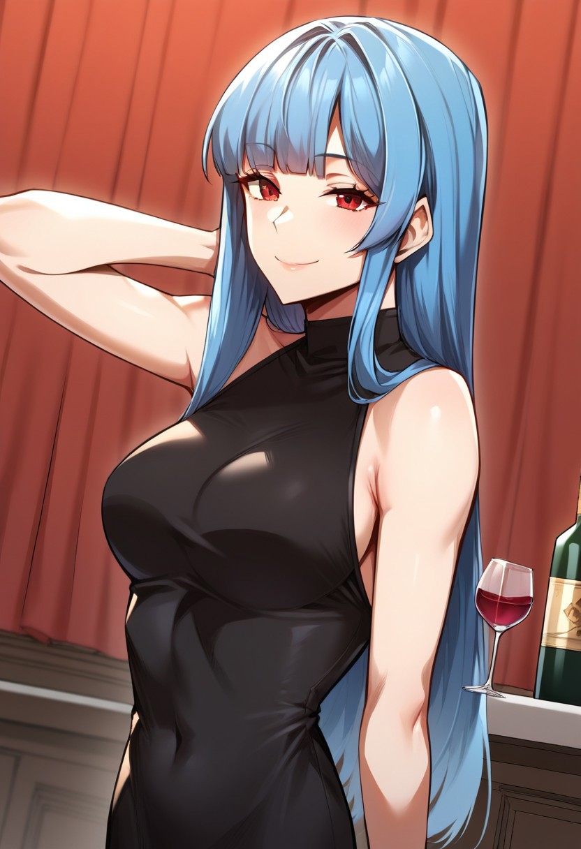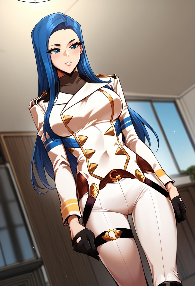 1girl,gheist,blue eyes,blue hair,long hair,large breasts,uniform,military uniform,white pants,belt,sheath,black gloves,black knee boots