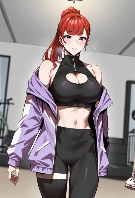 1girl,gbubble,large breasts,purple eyes,ponytail,red hair,long hair,bangs, breasts, purple jacket,naveloff shoulder,cleavage,clothing cutout,cleavage cutout,sports bra,yoga pants,black pants,sneakers,white footwear,