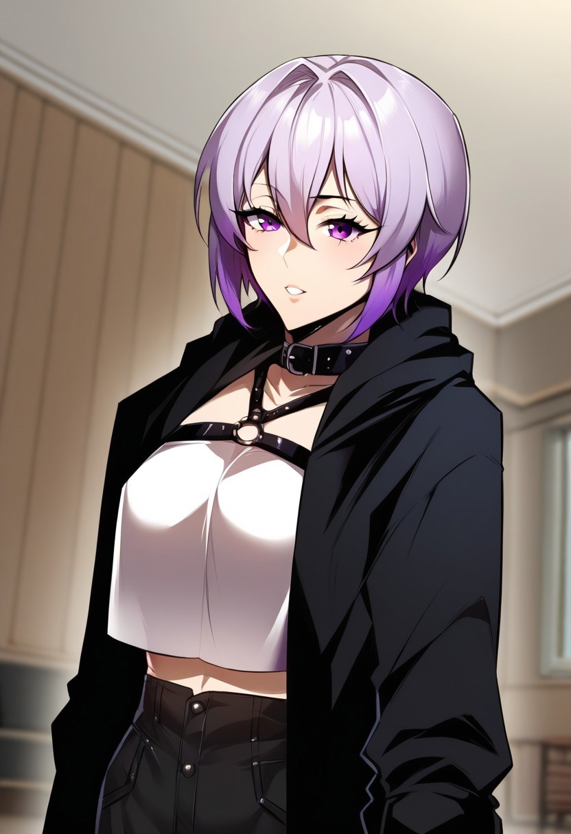 1girl,gchrome,purple eyes,multicolored hair,purple hair,short hair,bangs,hair between eyes,breasts,chest strap,crop top,o-ring,black pants,choker,collar,black coat,