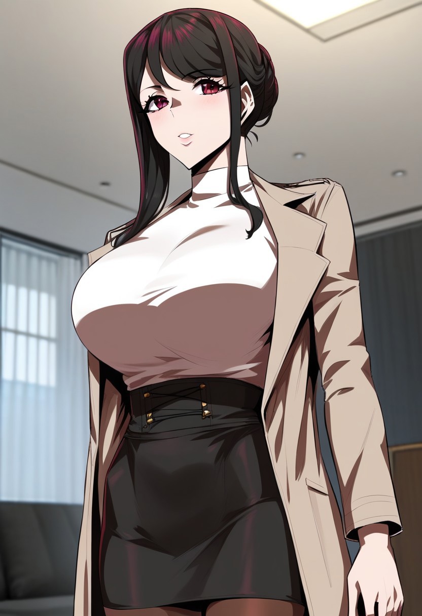 1girl,gsistr,large breasts,sidelocks,black hair,long hair,bangs, brown coat,long sleeves,open coat,white shirtturtleneck,high-waist skirt,black pencil skirt,brown pantyhose,