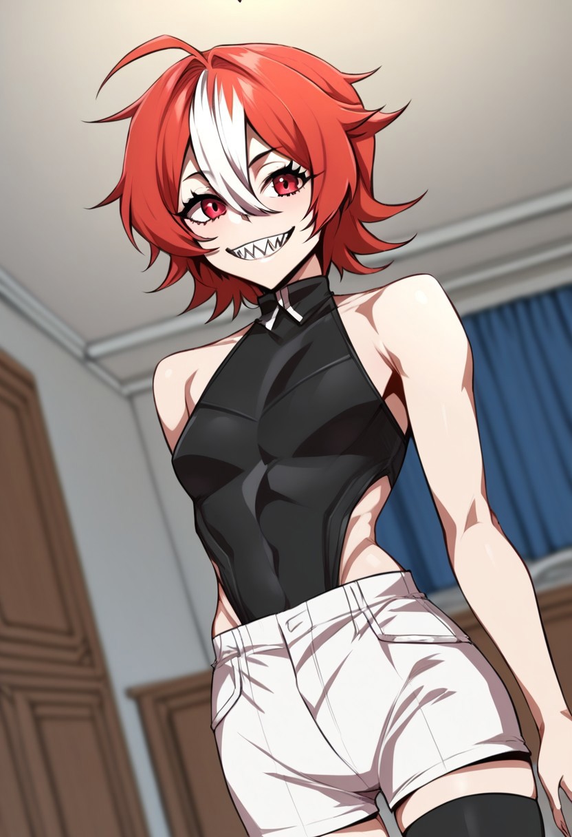 1girl,gvilred,small breasts,red eyes,multicolored hair,red hair,hair between eyes,two-tone hair,ahoge,short hair,white hair,sharp teeth,teeth,leotard,bare shoulders,white shorts,smile,highleg,black thighhighs,toeless legwear,