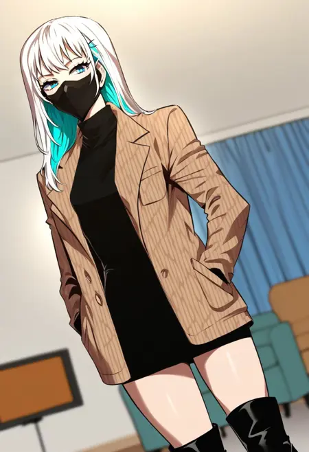 1girl,gbanshee,blue eyes,multicolored hair,two-tone hair,colored inner hair,white hair,aqua hair,long hair,bangs,black dress,turtleneck,jacket,open jacket,mask,mouth mask,black gloves,black boots,knee boots,
