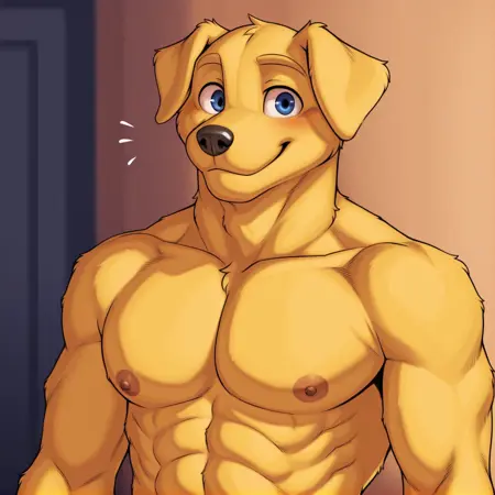 travis, male, blue eyes, (solo:1.2), furry, dog, muscular, nipples, pecs, nude, naked, penis, balls, tail, blush, yellow body, <lora:travis:1.1>, feet, ass, anus,