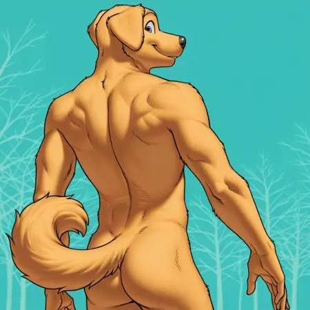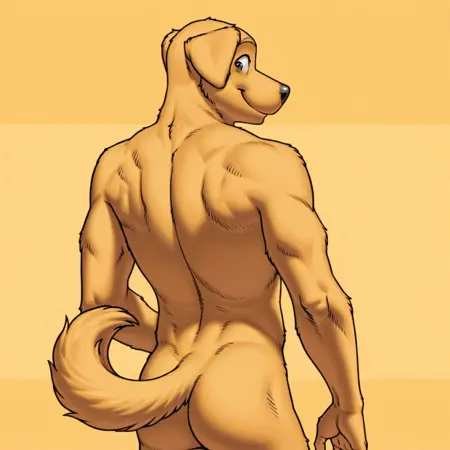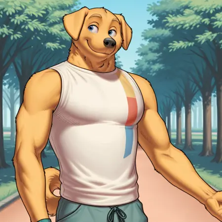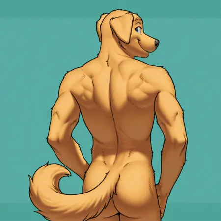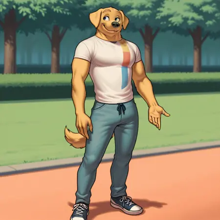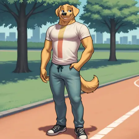 travis, (1boy:1.2),(solo:1.5), yellow fur, dog, blue eyes, muscular, tail, standing, , casual clothes,
