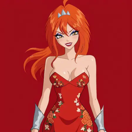• Trigger with possessed Bloom: DarkBloomPossessed, 1girl, lipstick, midriff, gloves, crop top, makeup, blue skirt, red hair, fairy wings, cowboy shot