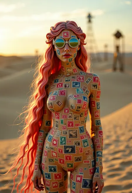 이 FLUX LoRA는 스탬프 스타일 패션용입니다 – 과거의 우표가 옷이나 여성 또는 남성의 피부 위에 있기도 하는, 시각적으로 풍부하고 초현실적이고 꿈같은 아트를 융합한 스타일입니다.