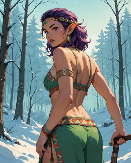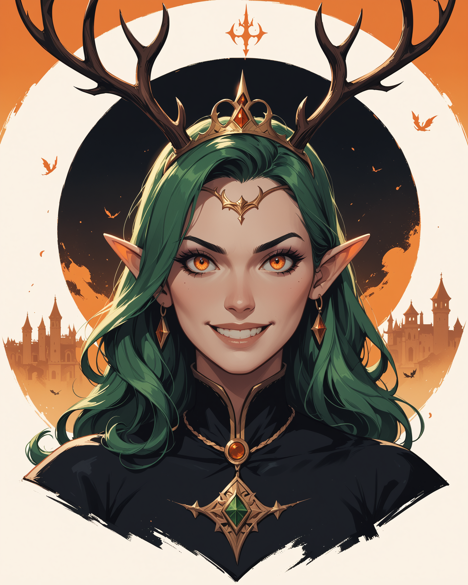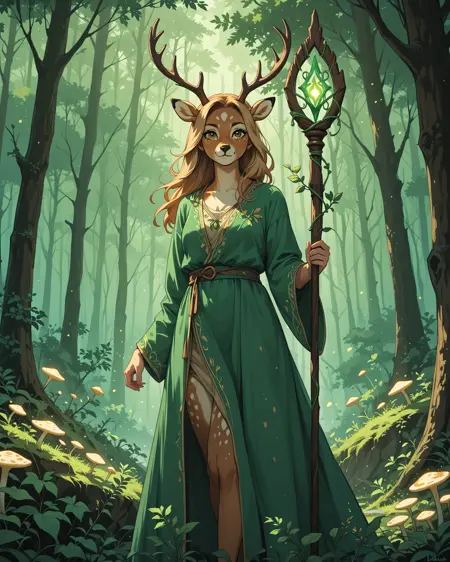 score_9,score_8_up,score_7_up, 1girl, deer anthro druid, age 28, graceful with light brown fur and white spots, antlers adorned with moss and flowers, soft hazel eyes, wearing a flowing green robe with leaf patterns, holding a staff entwined with vines, standing in a dense magical forest with glowing mushrooms, green and blue tones with golden highlights, serene and wise, glowing nature magic surrounding her, forest spirits in the background, pose, detailed background, cinematic lighting, view from below.빠른 네거티브 프롬프트