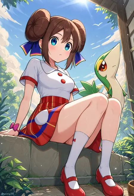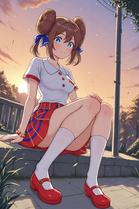 rosalnb, (solo:4), brown_hair, blue_eyes, hair_ribbon, double_bun, twintails, dress, collared_shirt, white_shirt, red_skirt, multicolored_clothes, short_sleeves, red_buttons, white_pockets, single_bracelet, ribbon_bracelet, knees, white_socks, red_footwear, mary_janes