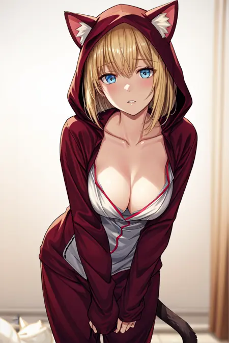 (animal costume:1.2), animal ears, animal hood, bangs, blonde hair, blue eyes, cat costume, cat ears, cat hood, cat tail, collarbone, drawstring, eyebrows visible through hair, fake animal ears, fake tail, hood, hood up, hoodie, long sleeves, looking at viewer, (pajamas:1.3), parted lips, short hair, slippers, solo, tail, white footwear;